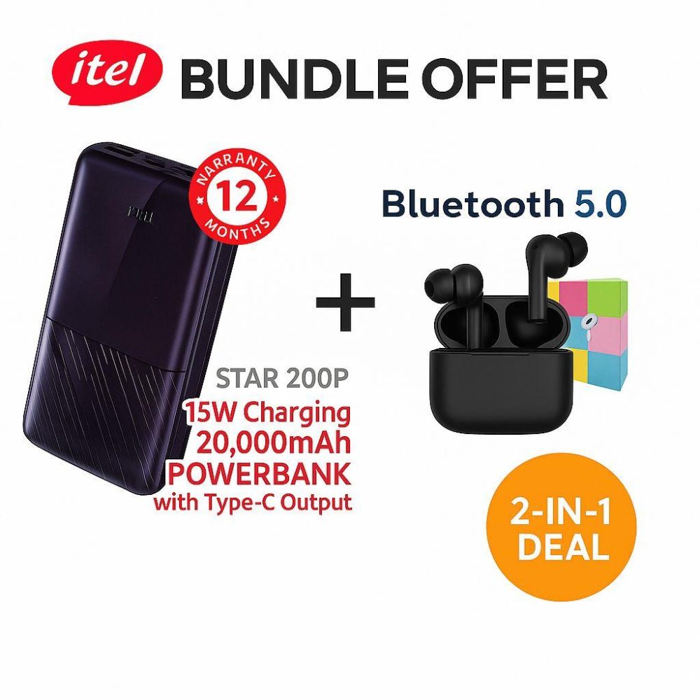 Stay powered and connected anywhere with the itel Star 200P 20,000mAh Power Bank (15W Fast Charging, Dual USB + Type-C) bundled with Generic AirPods Pro (Bluetooth 5.1, Noise Cancelling, HD Sound) — the perfect combo for work, travel, and entertainment in Nigeria.