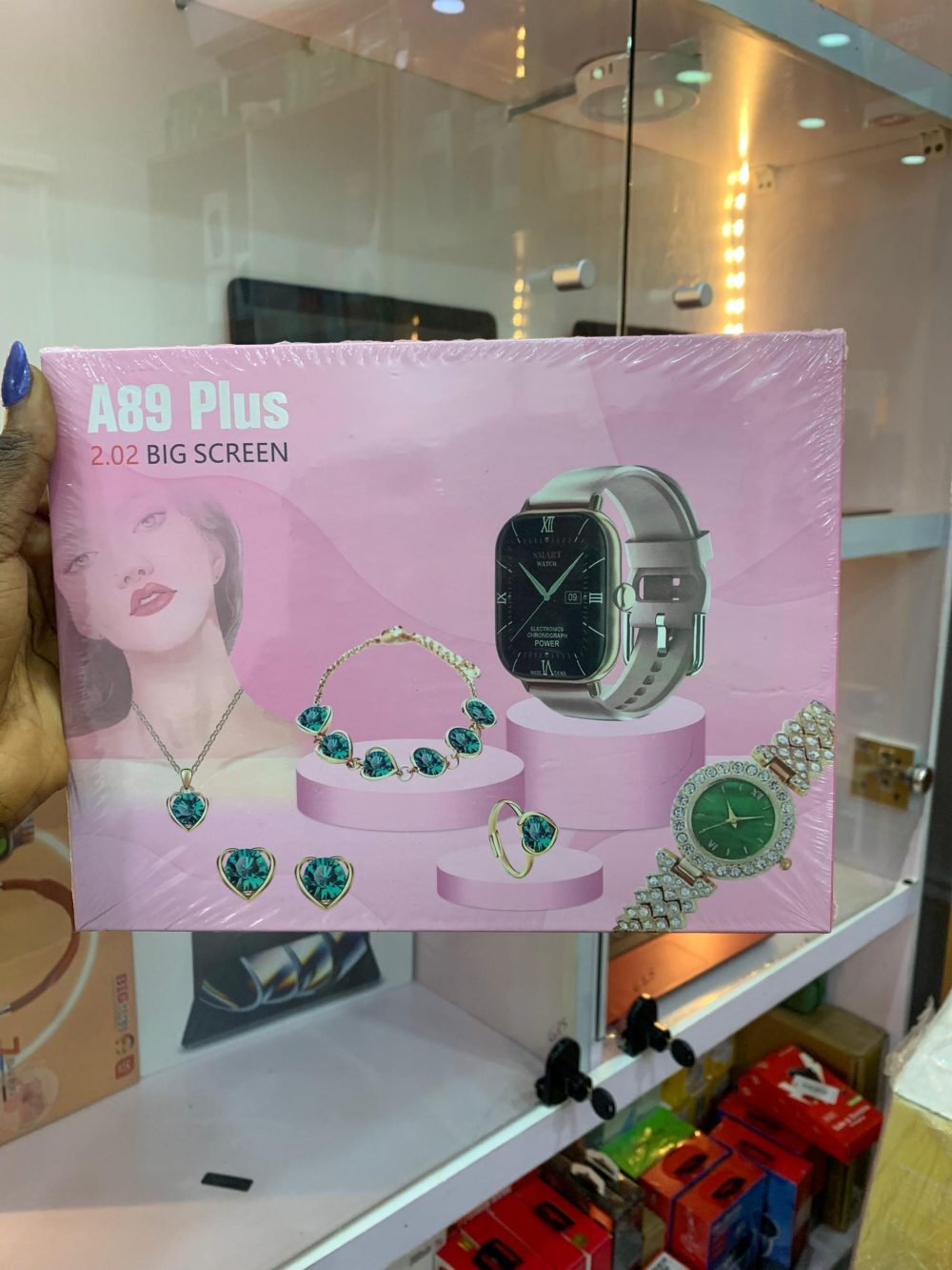 Experience tech, style, and luxury in one package with the A89 Plus Smart Watch 5-in-1 Gift Set.