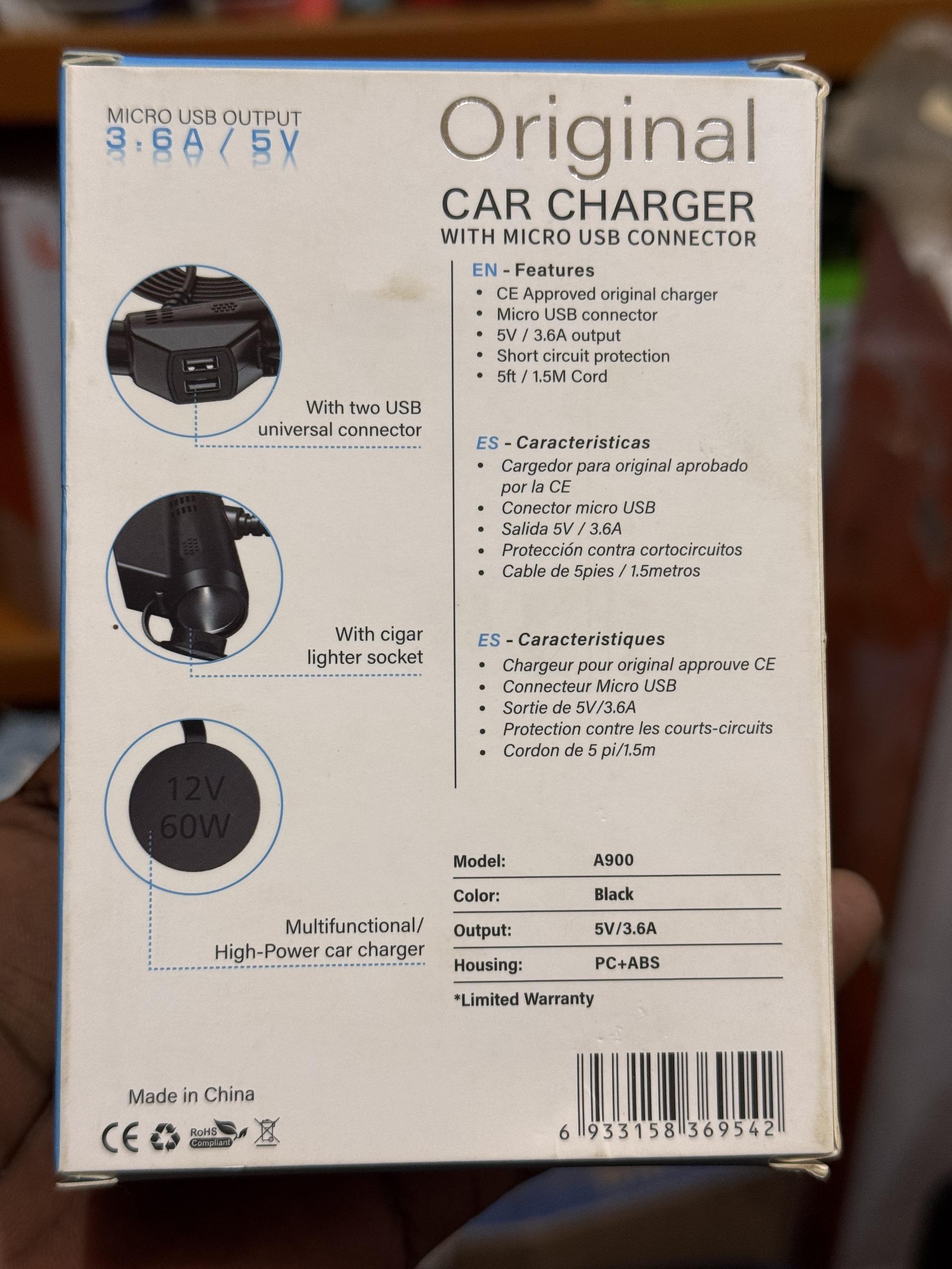The AAA A900 Original Car Charger is a multifunctional, high-power car charging solution designed for users who need reliable, fast charging on the go. Equipped with dual USB ports, a built-in Micro USB connector, and an additional cigarRette lighter socket, it supports multiple devices at once.