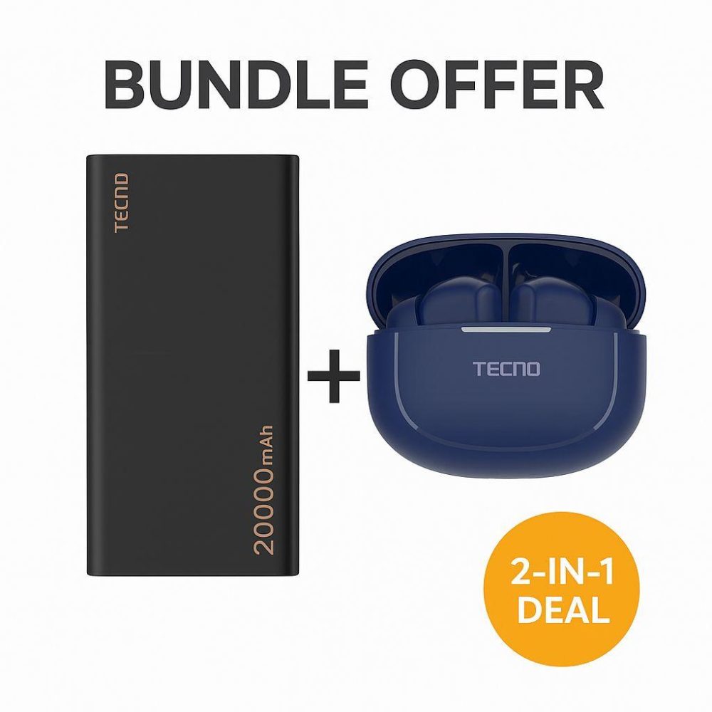 Tecno Omni-TANK 20,000mAh High-Speed Power Bank (Dual Output, Smart Protection, Fast Charging – TPB-P202) + Tecno Buds 4 Air TWS Earbuds (22H Playtime, Deep Bass, AI-ENC Calls, Bluetooth 5.4)