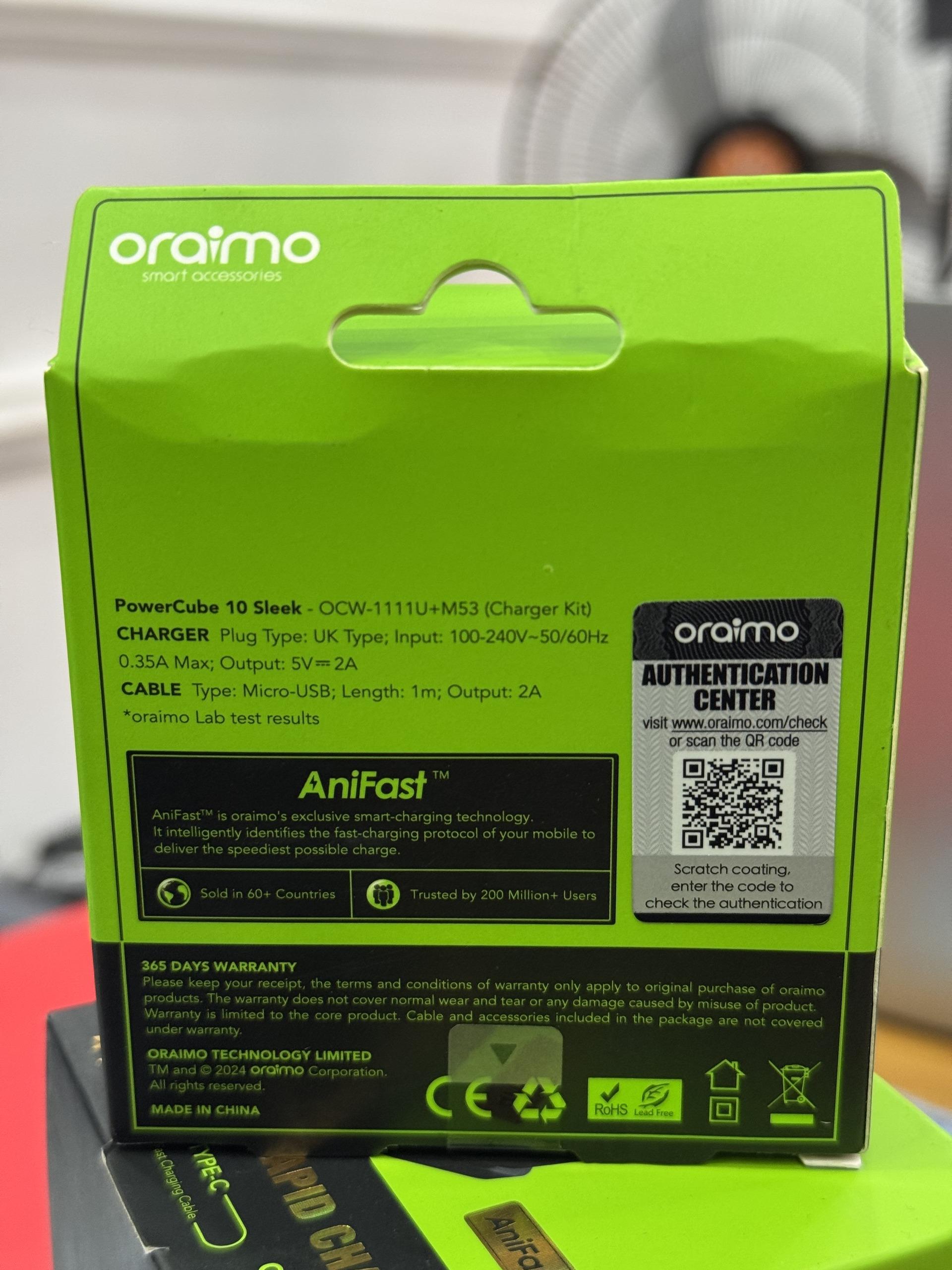 The Oraimo PowerCube 10 Sleek (OCW-1111U + M53) is a compact, efficient, and stylish charger kit built for reliable everyday charging. It delivers 5V/2A (10W) output, perfect for smartphones, Bluetooth devices, and more.