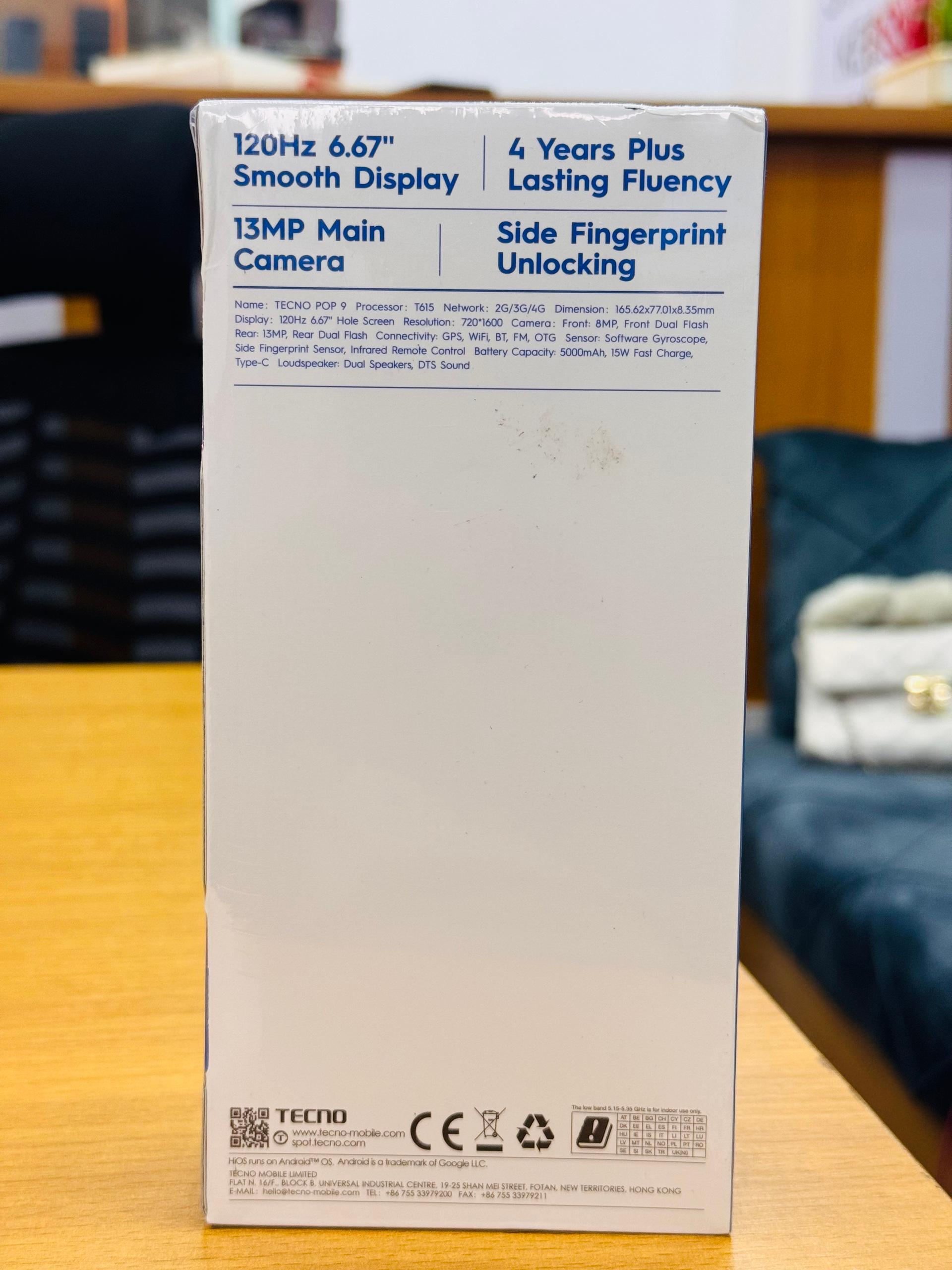 You’re getting a brandnew, original Tecno Pop 9, complete with modern features, dual flash cameras, stylish build, and Type-C fast charging.